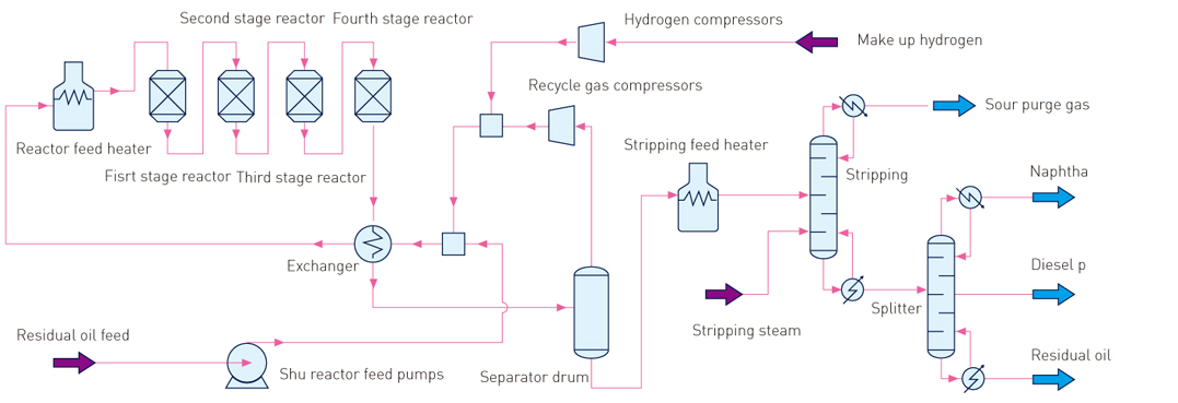 Double series are set in reaction section. Every series can be operated alone. The reactor is single bed and bed distributor has good performance. The hydraulic recovery turbine is set between hot high pressure separator and hot low pressure separator. Fractionation section uses single fractionating column.